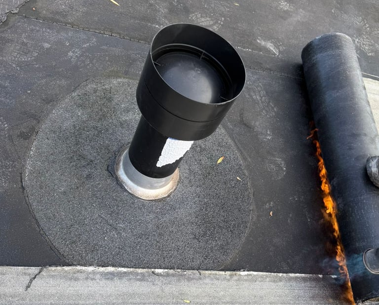 De dakbedekking wordt laag voor laag aangebracht en zorgvuldig afgewerkt.